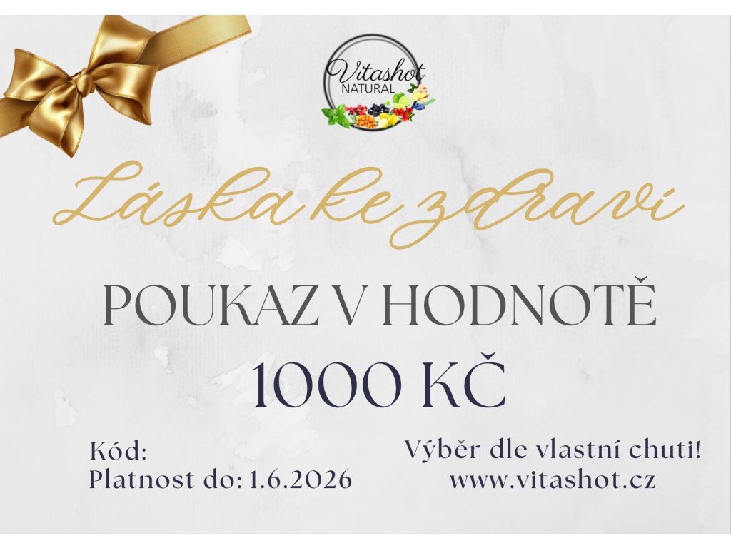 Dárkový poukaz Vitashot v hodnotě 1000 Kč je ideální volbou pro všechny, kteří milují zdravý životní styl, kvalitní suroviny a skvělou chuť.